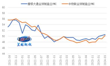 另據摩根大通數據顯示,2024年3月份,摩根大通全球製造業PMI指數為50.6%,較上月回升0.3個百分點;其中,產出指數、新訂單指數在擴張區間繼續回升,其中,產出指數較上月回升0.7個百分點,至51.9%;新訂單指數較上月回升0.5個百分點,至50.9%。2024年3月份監測的20個全球主要國家和地區製造業PMI指數中有10個國家製造業PMI處於50%以上,與上月持平;有11個國家及地區製造業PMI指數較上月有所回升,占比達55%,較上月下滑15個百分點,反映全球製造業恢複態勢有所分化。