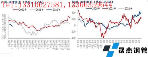 1月份廣州、杭州市場市場價格漲幅緩慢,北京市場價格漲幅居前,因此廣州-北京、杭州-北京市場的區域價差均有所收窄。目前廣州-北京價差在300元/噸左右,此價差略低於2020年、2021年同期水平,且結合無縫蜜桃视频成人APP鋼管廠家的政策以及運費來看此價差也不足以吸引北方區域資源南下廣州。目前杭州-北京價差不足100元/噸,因北京價格相對高位,加之東北區域節後需求啟動較晚,因此東北區域部分無縫蜜桃视频成人APP鋼管廠家傾向於把資源投放至北京區域,其中西林、新撫鋼甚至於海鑫都有此安排。