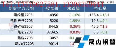 熱軋板卷:3月8日,全國24個主要城市4.75mm熱軋板卷均價5268元/噸,較上個交易日下跌21元/噸。黑色商品期貨市場早盤弱勢震蕩運行,午後跳水震蕩趨弱,午後市場繼續下調報價,近期市場報價較亂,多被盤麵帶動,市場買家也跟隨盤麵大幅波動而選擇觀望為主。整體來看,近期價格波動幅度較大,主要受海外地緣衝突升級導致,實際供需並未發生大的變化。綜合來看,預計9日價格或將以震蕩趨弱為主。