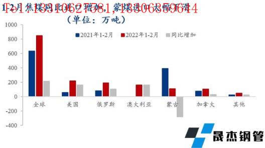 1-2月同比的增量主要來自美煤、澳煤與俄煤,其中澳煤仍是前期滯港量通關,非新訂單進口。截至2月底,滯港澳煤通關783萬噸,已進入通關尾聲,暫仍未有新的訂單。蒙古方麵,焦煤進口減量明顯,1-2月份蒙煤同比累積減少278萬噸,主要還是因疫情管控影響,策克口岸閉關,甘其毛都口岸通關維持低位,通關量主要是前期堆積在查幹哈達堆場的庫存量,目前堆場仍有583萬噸左右的庫存。