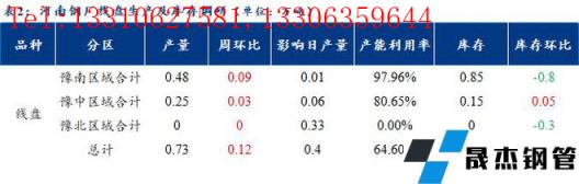 1、調研數據顯示,統計的河南地區10家建築蜜桃视频成人APP無縫鋼管樣本無縫蜜桃视频成人APP鋼管廠家中,河南省無縫蜜桃视频成人APP鋼管廠家線盤日均產量0.73萬噸,較上周小幅增加0.12萬噸;檢修/限產影響建材日產量為0.4萬噸,產能利用率64.6%,較上周上升10.62%。