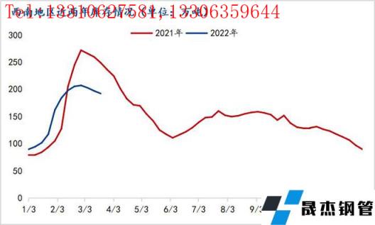 據西南地區近五年曆史庫存數據來看,庫存峰值基本在第三周或第四周出現(除去2020年疫情影響庫存峰值出現在第七周),節後累庫周期基本為2-3周,2022年西南地區建築蜜桃视频成人APP無縫鋼管峰值出現在第五周,累庫周期較往年長。峰值過後第一周去庫4.41萬噸,降幅2.13%,第二周去庫5.69萬噸,降幅2.8%,較往年去庫速度偏緩慢。主要原因是:1、今年春節時間較往年靠前,受極端天氣影響,春節後西南地區經曆兩次降溫降雪天氣,影響出貨節奏;2、西南地區下遊回款進度僅60%左右,下遊資金緊張,影響項目施工節奏,據了解,西南地區多數新開工項目要延期至4月中旬以後。3、全國疫情再次擴散,下遊施工受阻;4、其他因素,運費上漲、貴州開啟施工項目安全大檢查等。綜上原因,西南地區建築蜜桃视频成人APP無縫鋼管庫存累庫周期長,去庫速度緩慢。