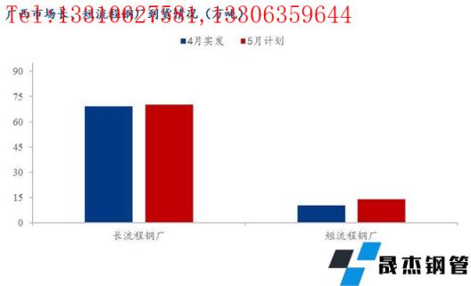 1、5月份廣西地區建築材省內長流程無縫蜜桃视频成人APP鋼管廠家計劃供應量共計70.3萬噸,環比增加1.2萬噸,增幅為1.74%;短流程無縫蜜桃视频成人APP鋼管廠家到貨量為13.9萬噸,環比增加3.5萬噸,增幅為33.65%。