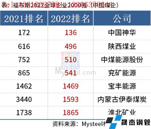 5月12日,福布斯2022全球企業2000強發布。據統計,中國煤炭行業共有7家企業上榜。分別是中國神華、陝西煤業、中煤能源股份、兗礦能源、寶豐能源、內蒙古伊泰煤炭和淮北礦業。具體排名如下:
