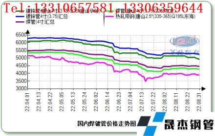 8月國內焊管、鍍鋅管價格震蕩攀高。據雲商平台監測數據顯示,截至8月31日,全國4寸(3.75)國標焊管平均價格4454元,比上月同期上漲90元,全國4寸(3.75)鍍鋅管平均價格5245元,比上月同期上漲35元;全國50*50*2.5方管平均價格4498元,比上月同期下跌1元;全國219*6螺旋管平均價格4807元,比上月同期上漲44元(詳見圖1);成交價格上漲過程,調幅相對靈活。