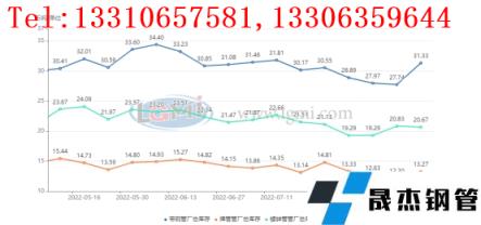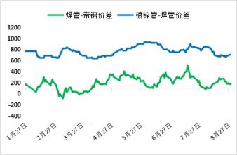 8月焊鍍管與原料價差收縮173元(詳見圖2)。焊管生產利潤一度虧損百元左右,繼續出現停購原料2-3天的情況;鍍鋅管生產利潤相對抗跌,整體處於虧損邊緣。結算周期內焊管生產利潤核算平均盈利12元,鍍鋅管生產利潤核算平均盈利57元。